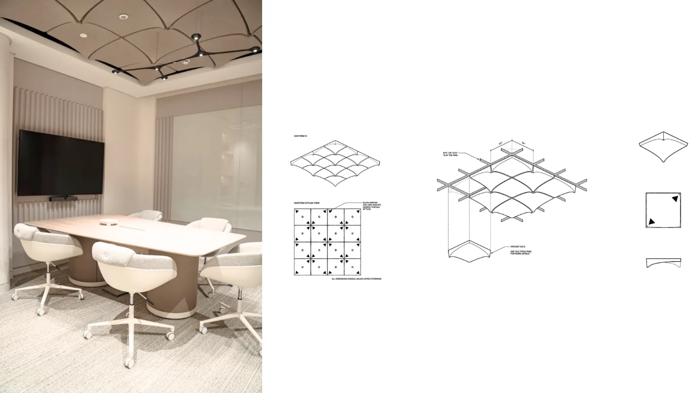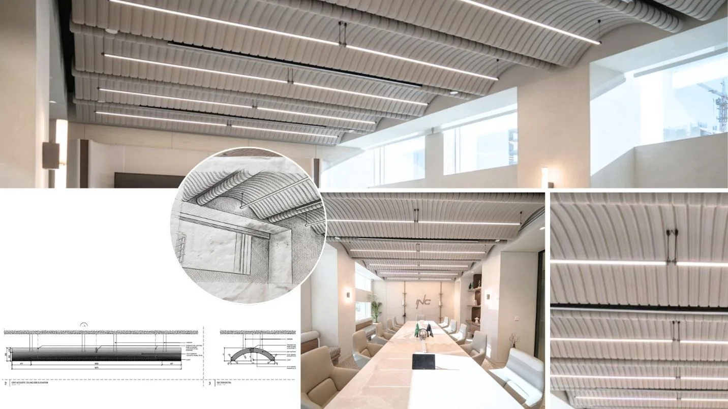 In the Boardroom, a concave geometry was introduced to enhance acoustic performance, allowing sound to travel smoothly along a curved surface and improving overall clarity within the space.