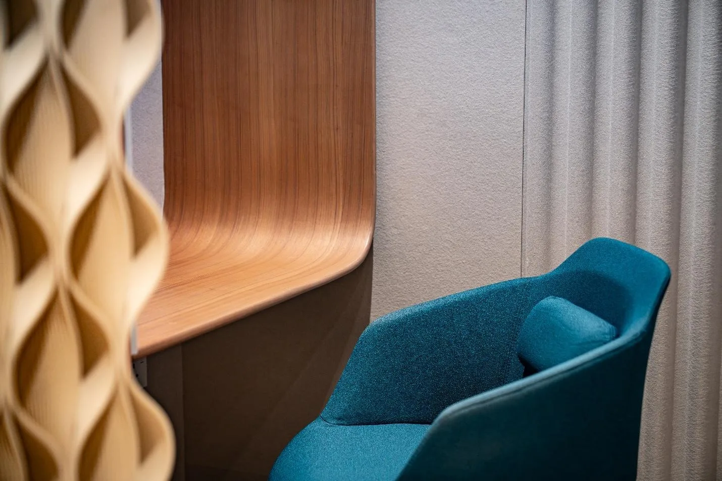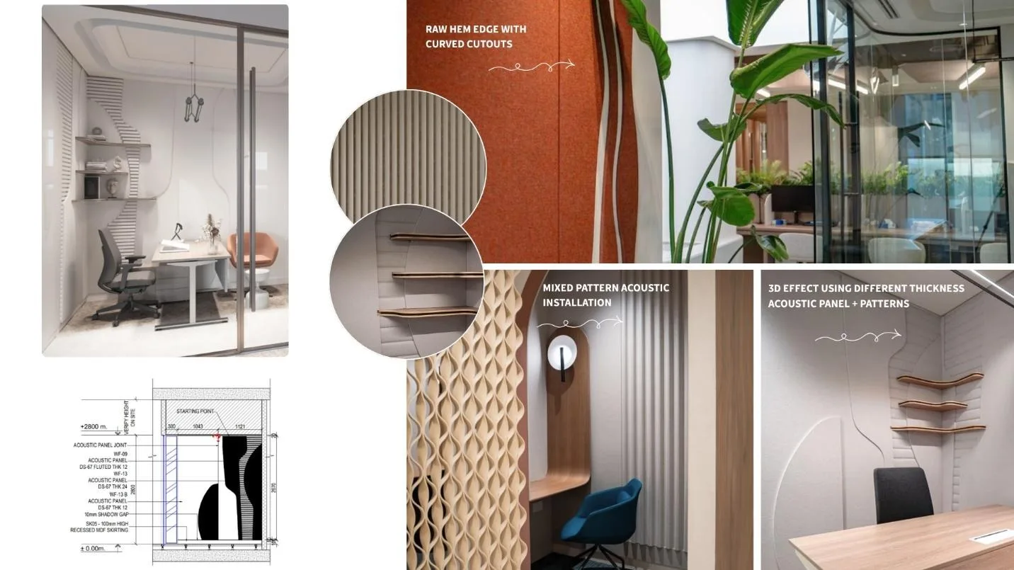 The acoustical wall panels are thoughtfully integrated across the space, as seen in the images, where they are applied as vertical ribbed features, sculptural textured surfaces, and soft fabric finishes. They are positioned behind seating areas, within meeting niches, and along circulation walls to absorb sound where conversations and activity are most concentrated. This placement helps reduce echo and enhances speech clarity, creating a more comfortable and private environment.
