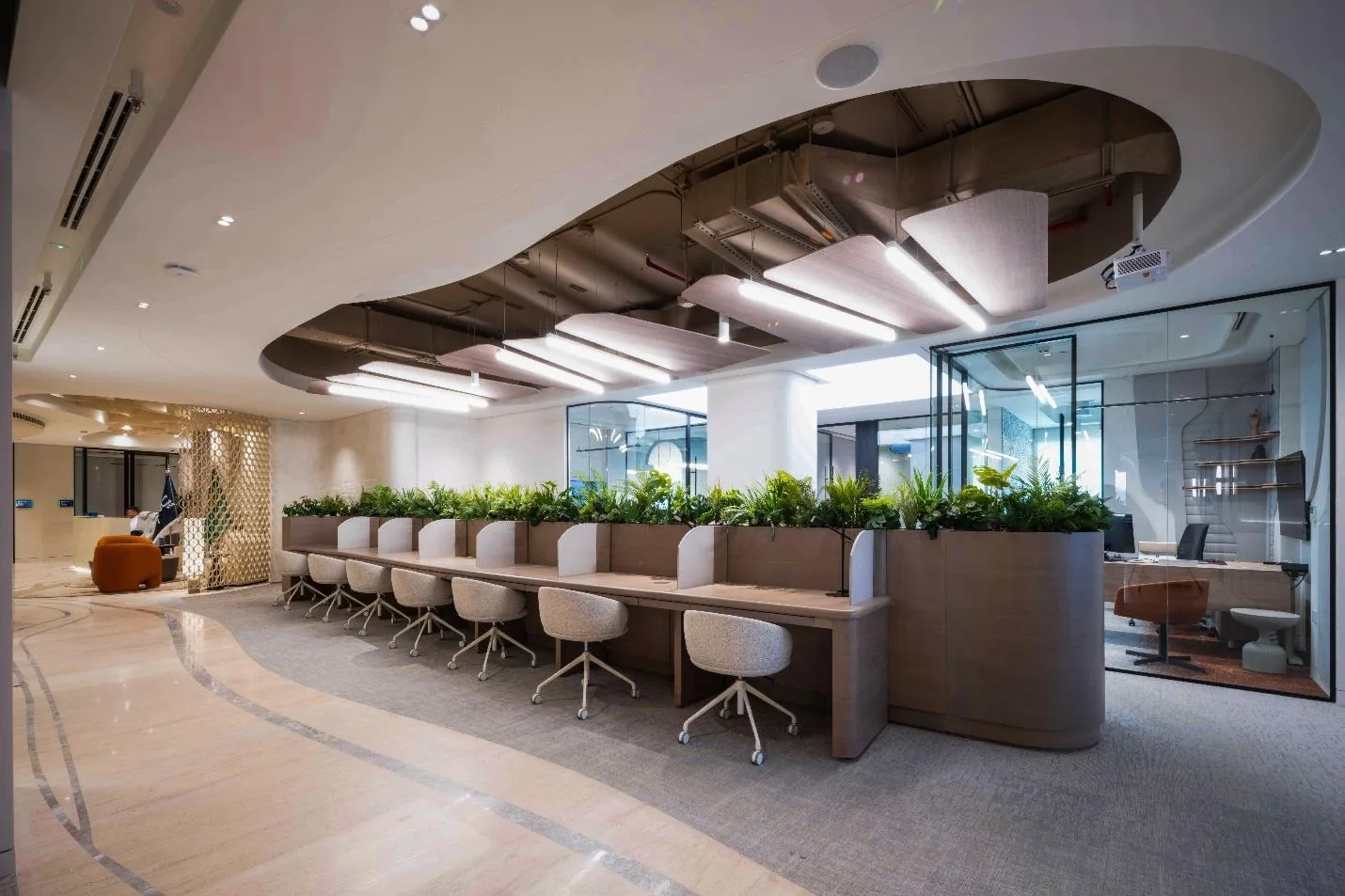 The ceiling design is inspired by soft, organic forms that resemble overlapping petals or flowing fabric, creating a sense of movement and continuity across the space. The curved, modular panels are arranged in a rhythmic pattern that feels both structured and fluid, echoing natural geometries while maintaining a refined, contemporary look. This sculptural approach softens the ceiling plane, breaking away from flat surfaces and introducing depth and visual interest. At the same time, the gentle curves help diffuse sound and light, enhancing both the acoustic performance and the overall ambience of the space.
